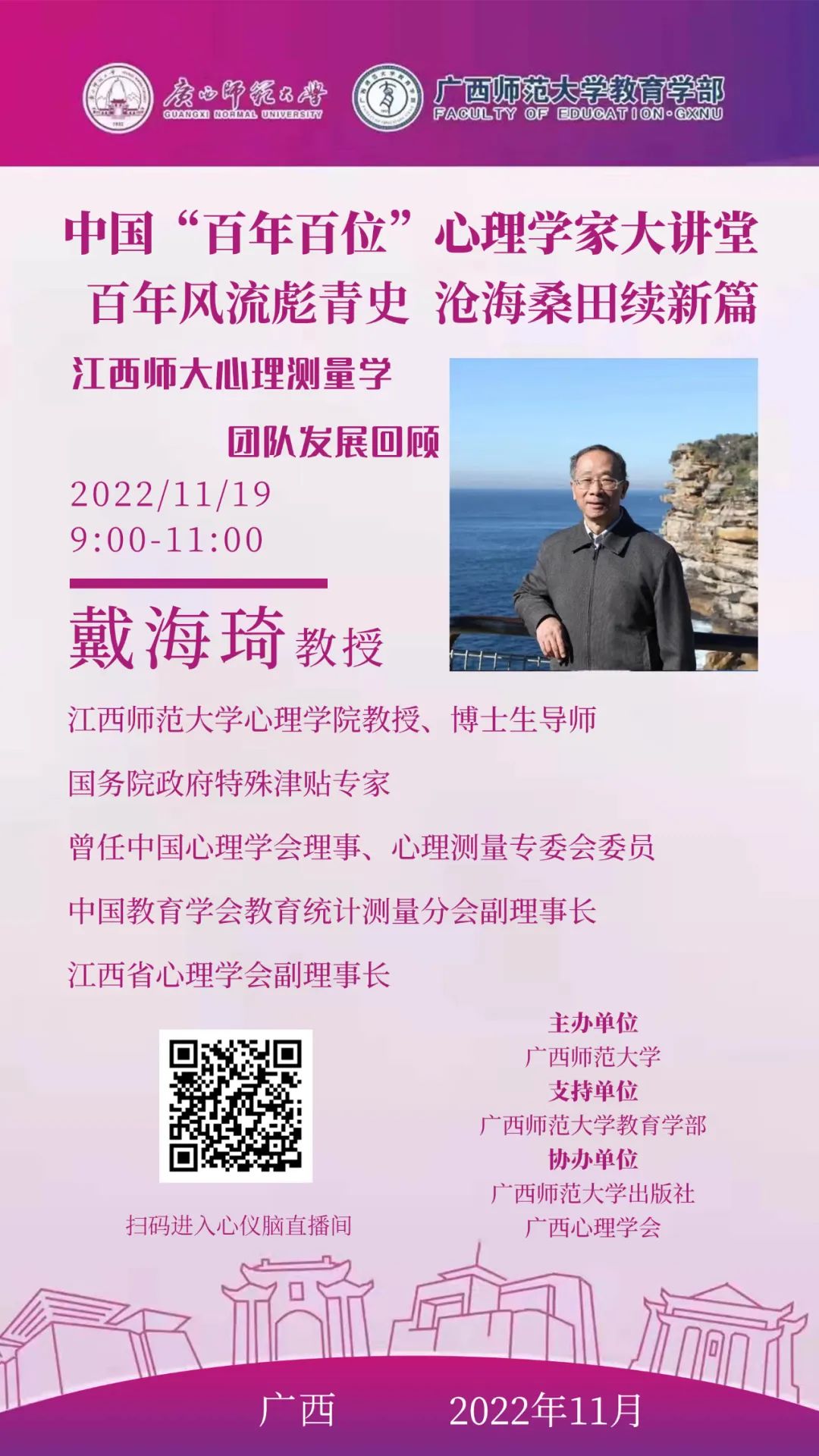 戴海琦教授,江西师范大学心理学院教授、博士生导师国务院政府特殊津贴专家,曾任中国心理学会理事、心理测量专委会委员、中国教育学会教育统计测量分会副理事长、江西省心理学会副理事长。