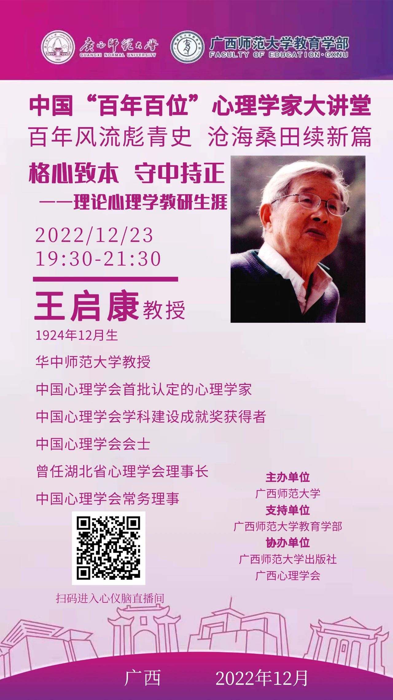 王启康教授,1924年12月生。华中师范大学教授,中国心理学会首批认定的心理学家、中国心理学会学科建设成就奖获得者、中国心理学会会士。曾任湖北省心理学会理事长、中国心理学会常务理事。