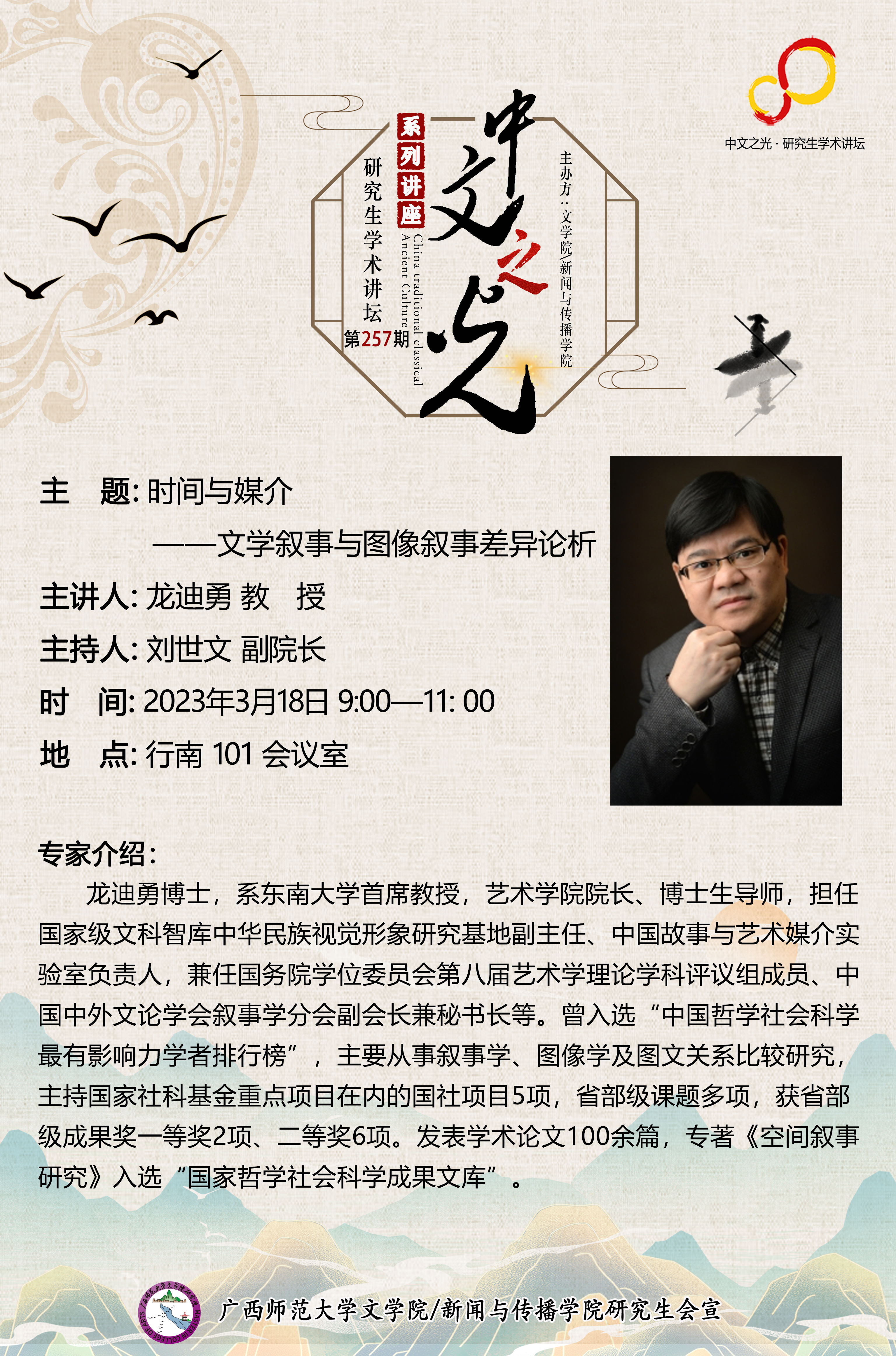 主讲人简介:龙迪勇,博士,东南大学首席教授,艺术学院院长、博士生导师,担任国家级文科智库中华民族视觉形象研究基地副主任、中国故事与艺术媒介实验室负责人,兼任国务院学位委员会第八届艺术学理论学科评议组成员、中国中外文论学会叙事学分会副会长兼秘书长等。曾入选“中国哲学社会科学最有影响力学者排行榜”,主要从事叙事学、图像学及图文关系比较研究,主持国家社科基金重点项目在内的国社项目5项,省部级课题多项,获省部级成果奖一等奖2项、二等奖6项。发表学术论文100余篇,专著《空间叙事研究》入选“国家哲学社会科学成果文库”。