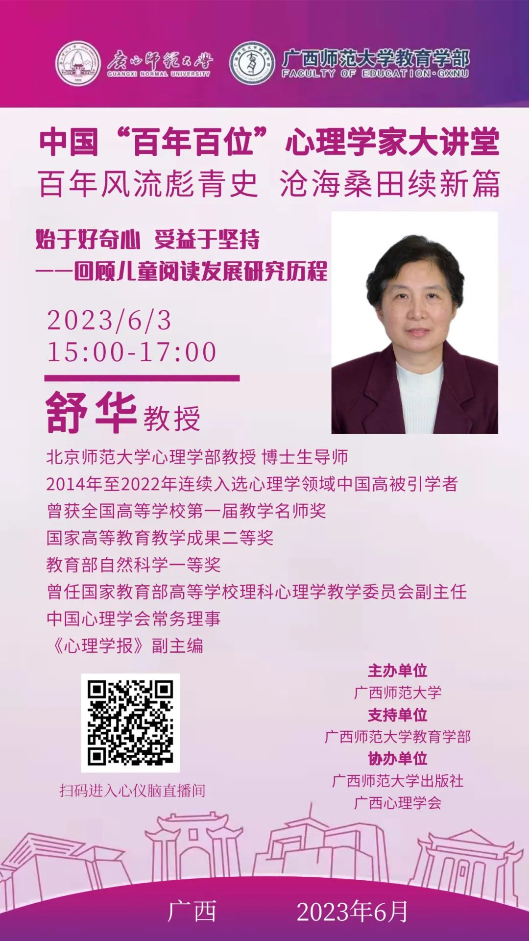 | 一、主题 中国“百年百位”心理学家大讲堂:百年风流彪青史,沧海桑田续新篇 二、举办单位 主办单位:华体会平台 承办单位:华体会平台教育学部 协办单位:华体会平台出版社、广西心理学会 三、直播时间和方式 2023年6月3日(星期六)15:00-17:00 扫码进入直播间(见附件) 电脑端观看:https://zwe.h5.xeknow.com/sl/2YeSSU 四、直播主讲人介绍 舒华教授,北京师范大学心理学部教授、博士生导师,2014年至2022年连续入选心理学领域中国高被引学者。曾获全国高等学校第一届教学名师奖、国家高等教育教学成果二等奖、教育部自然科学一等奖,曾任国家教育部高等学校理科心理学教学委员会副主任、中国心理学会常务理事、《心理学报》副主编。 五、后续专家预告 1.时勘教授 2.谭力海教授 3.李红教授 4.游旭群教授 5.白学军教授
