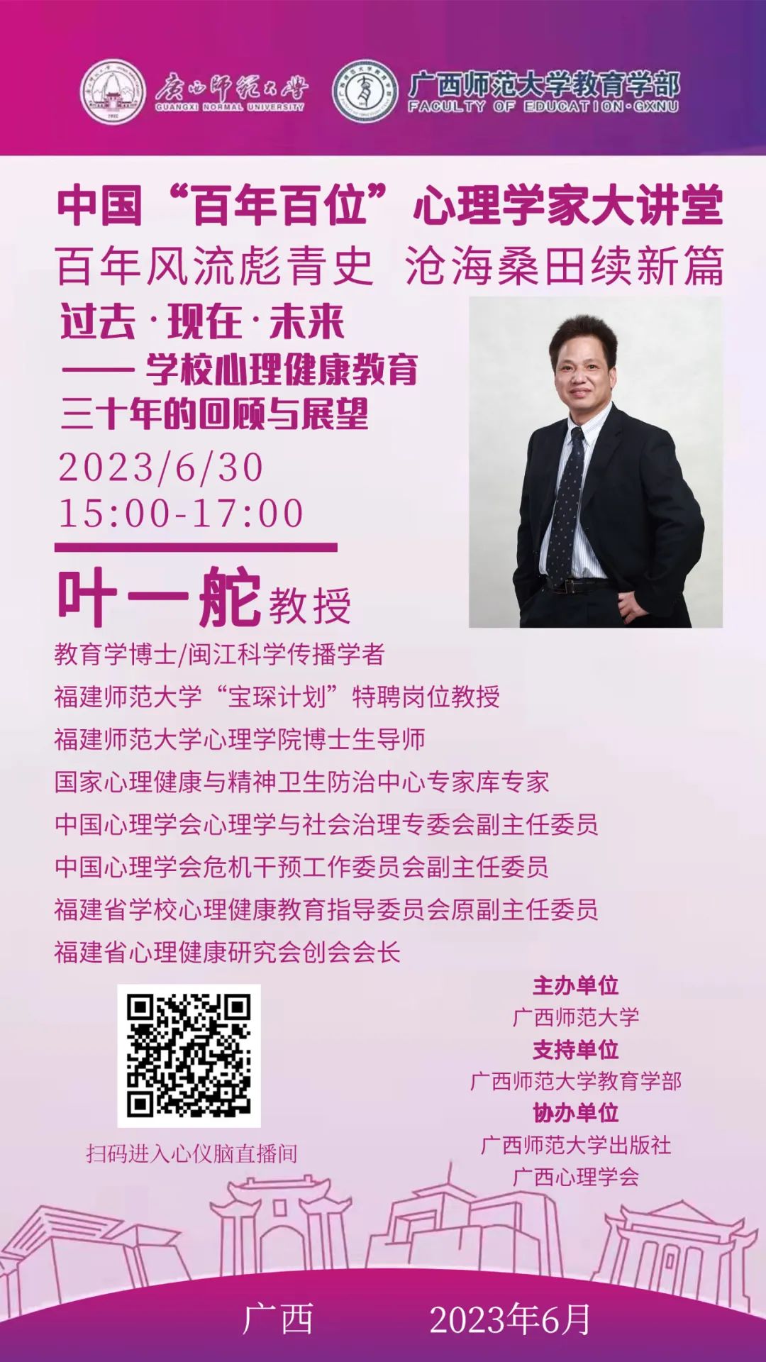 叶一舵教授,教育学博士、闽江科学传播学者,福建师范大学“宝琛计划”特聘岗位教授、福建师范大学心理学院博士生导师、国家心理健康与精神卫生防治中心专家库专家、中国心理学会心理学与社会治理专委会副主任委员、中国心理学会危机干预工作委员会副主任委员、福建省学校心理健康教育指导委员会原副主任委员、福建省心理健康研究会创会会长。