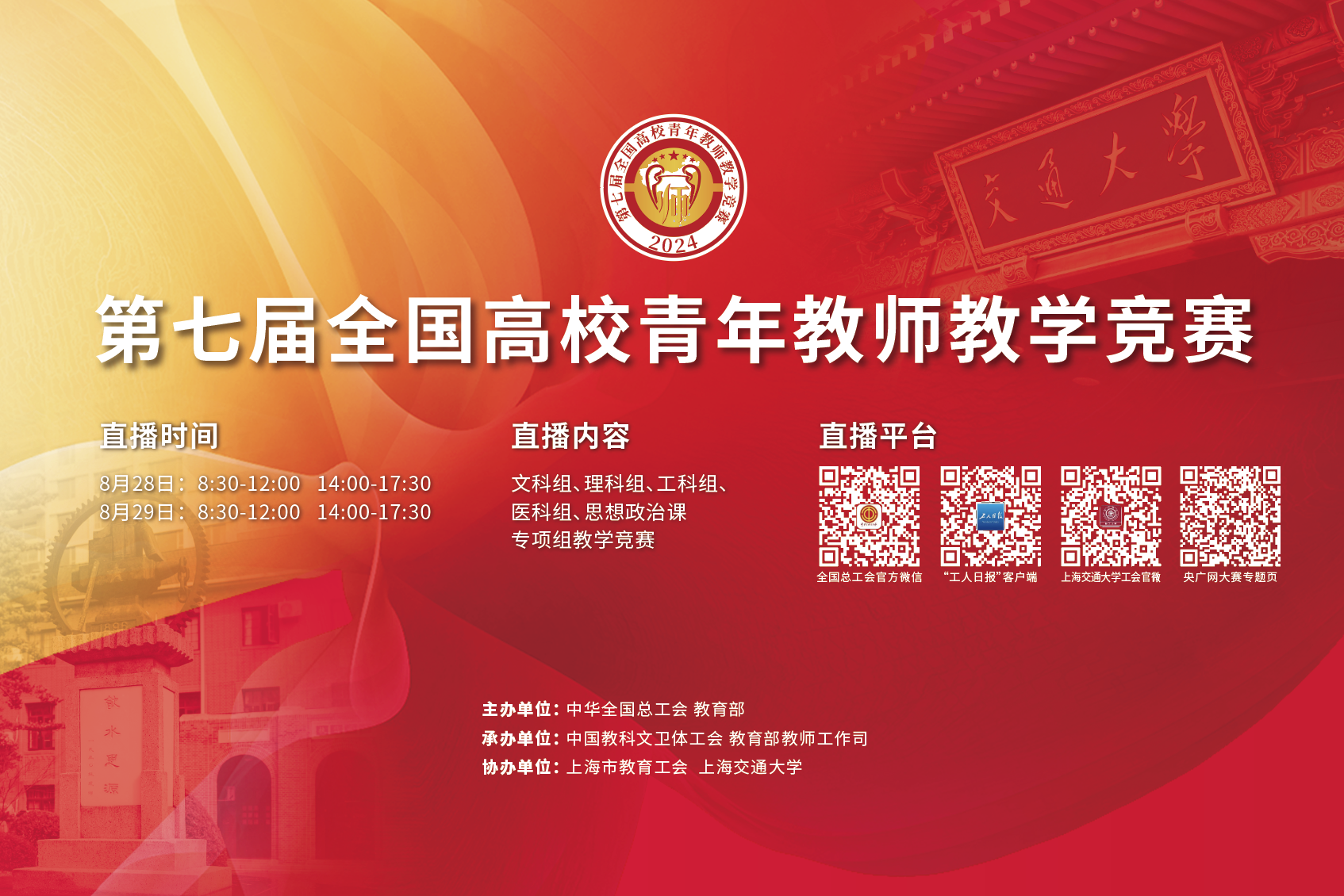 由中华全国总工会、教育部举办的第七届全国高校青年教师教学竞赛决赛,将于2024年8月26日至30日在上海举行,来自全国31个省(区、市)和新疆生产建设兵团的高校青年教师们将同台竞技。为更好发挥竞赛示范引领作用,助力高素质专业化教师队伍建设,决赛的课堂教学环节将同步进行网络直播。现将华体会平台组织收看相关事项通知如下: